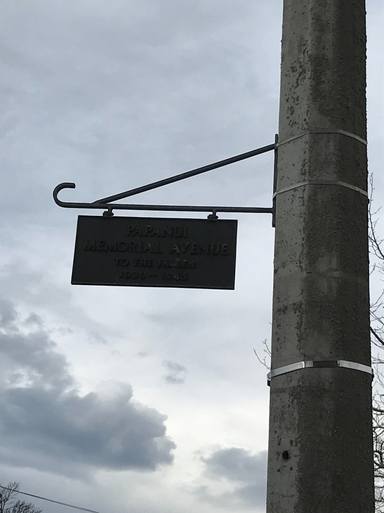 St James Avenue in Papanui – St James Park Road and James Avenue.Named after James Triggs (1816-1898). Triggs was a dairy farmer, and later a fruit-grower, of Papanui. He died at his residence in Harewood Road. James Avenue was formed on land once owned by St. Paul’s Anglican Church, Papanui where Triggs was the verger in the 1870s. St James Park Road first appears in street directories in 1892 running off Park Road (later Windermere Road); James Avenue in 1907 running off Papanui Road. The two were amalgamated and re-named St James Avenue in 1924. A Papanui war memorial street. [21 pairs of oak trees in the street were planted as a memorial to those who served in World War II. This street lost all of its young men during the war.]
