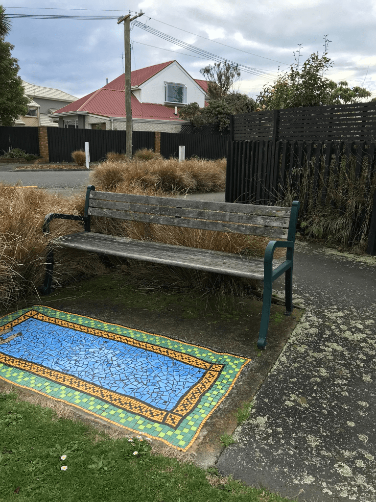 A small amount of information from the library website. Many birth, death and engagement notices on Papers Past. Also several notices about garden competitions. The earliest mention of Loftus St was in 1898. There was an overlap of using Lofthouse and Loftus names but nothing to say that the name officially changed. Lofthouse is a village not too far from Leeds. In 1920s several complaints about the state of the street plus in 1922 a letter to the editor said that the street had the worst footpath in Papanui. There was flooding in 1945 and there are creeks in the area. In 1965 the construction of a new building for the BNZ that will feature a 23 foot clock tower that will be illuminated at night. This building is no longer there. The BNZ is housing Age Concern. Most of the houses are from 1970s and 1990s but none of them stood out for me but I did like the street and mosaics on the corner of Loftus and Horner Streets.