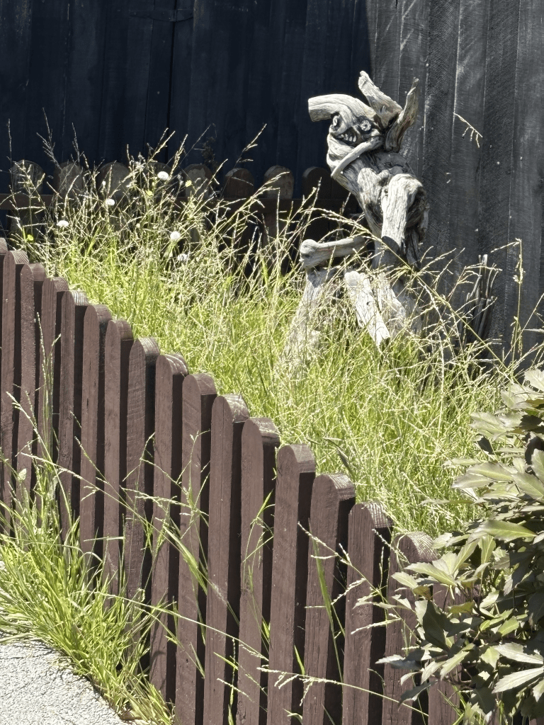 It looked like a pleasant street with a footpath on both sides of the street. A few had nice gardens but it was mostly immaculate lawns with shrubs. There was one garden which had a piece of driftwood that I liked.