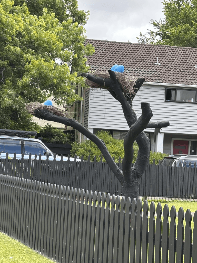 There is one house here that dates from 1930 but most houses were built between 1950s and 1980s. This is a pleasant tree lined street and on one side a big portion is taken up with Hillsborough Park. I am so sure that this park used to have more trees than what it now has. On the other side some of the houses have a hill behind them and this seems to be where some of the newer houses were built between 2013 and 2016. There was one house that I really liked and the house itself was fairly ordinary but it had a skeleton in the window. I am not the only nutter in Christchurch with skeletons. I also liked the tree in the front yard as it had been partially chopped down but in the remaining branches they had built a giant nest and put large blue balls in the nests.