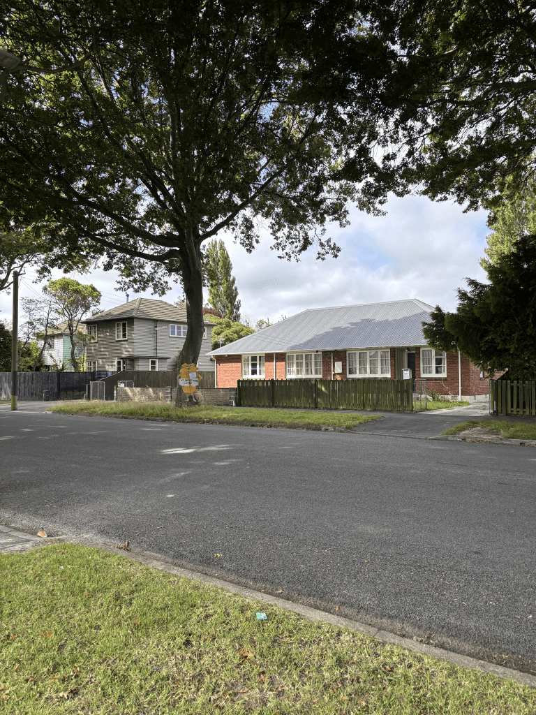 I started my walk at the Shirley Rd end where there is a big empty section and this is where the Anglican church used to be. All the houses here look like state houses and I believe that the entire street was originally state housing. Nearly half the houses are still state housing / social housing. I couldn’t tell the difference. Most houses were built in the 1950s. When walking the street I didn’t spot the Catholic church so I checked google maps and in May 2024 it was surrounded by scaffolding. Didn’t look like a church. The Presbyterian church seemed to have survived the earthquakes which is surprising as it was a brick building. The brick has now been painted white and the church is called Emmett Street Community Church. Lots of entrances to McFarlane Park and this is a long and mostly narrow park.