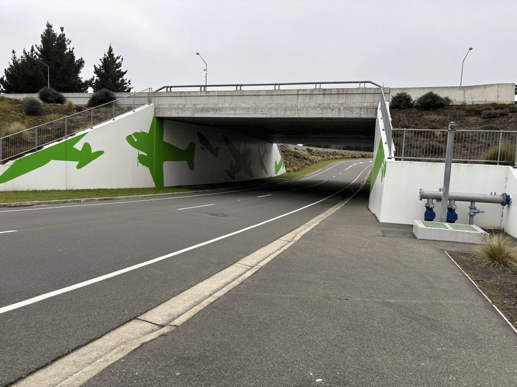 This street goes under the motorway and there are murals of aeroplanes here. After the tunnel there wasn’t a footpath but there was a large grassy verge