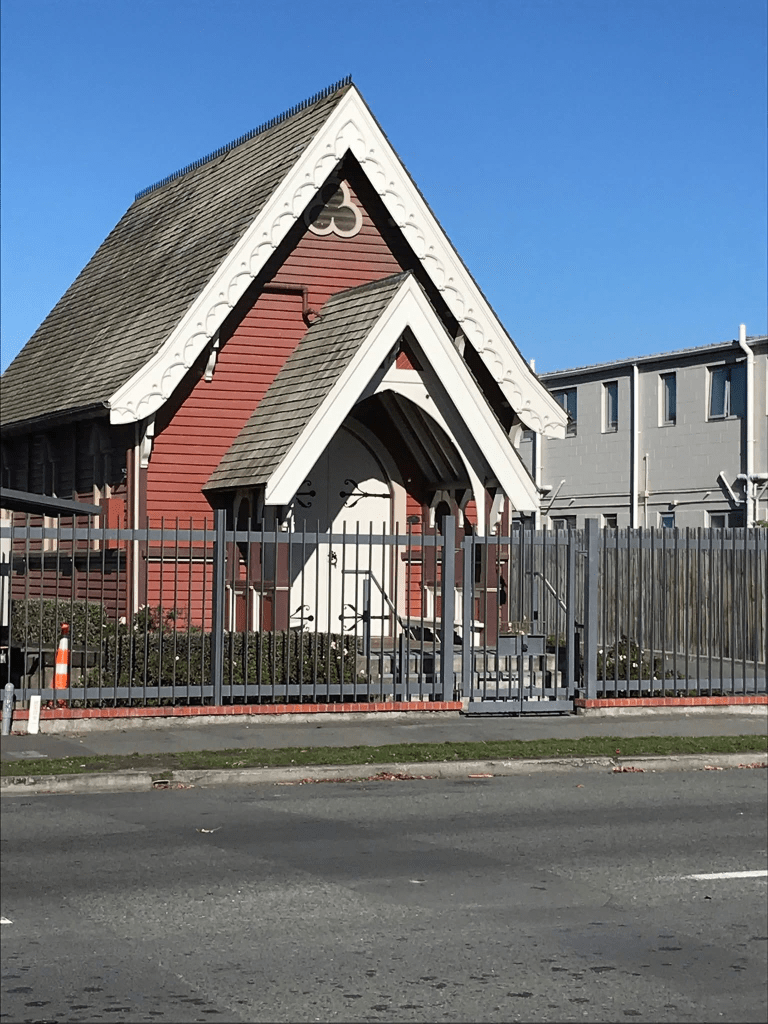 In 1888 a chapel was erected in the Woolston cemetery but once the cemetery was full up the chapel fell into disrepair. In 1949 the Church Property Trustees gave it to the North Canterbury Hospital Board who moved it to the Jubilee Home and renamed it St Luke’s Chapel. It was repaired and used for many years. The Jubilee Home was closed in 1990 against the wishes of the residents. The building was demolished and the site is occupied by a business. The chapel was moved to the city mission on Hereford Street so I looked on street view. I then checked my photos from when I walked Hereford Street and I have a photo of the chapel. The only photo that I could download for the Jubilee Home as it wasn’t copyrighted shows a group of men in front of the building. This surprised me as news articles made it clear that men weren’t encouraged to be residents of the home.