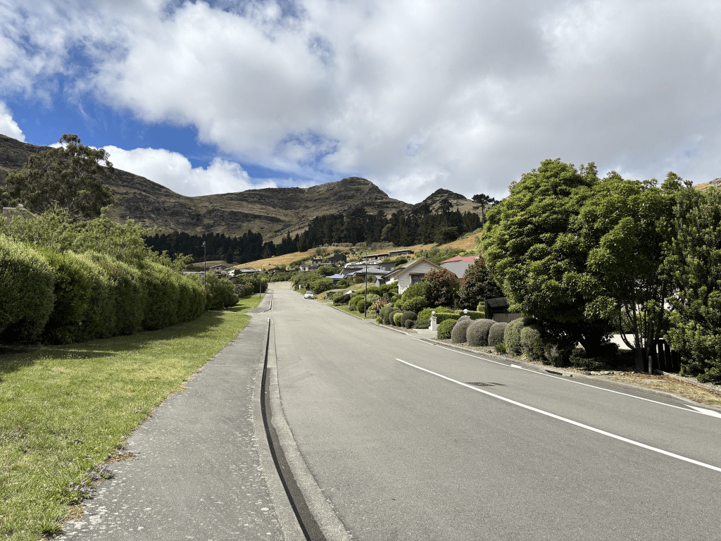 I was surprised that I hadn’t already walked this street for my project as I have geocached here. I found a geocache near the top of the street in 2017 and found another geocache in 2023. Most houses here date from 2000 with several built more recently. Some I liked and others I didn’t really like. There is one house that has a very interesting garden including a large sculpture of a horse. At the top of the street there is a gate blocking what I thought was a walkway. A sign about rockfall danger is on the gate. When I looked at street view from before the earthquakes there was a road leading to houses. These houses have all been demolished. There is another road that leads off the main road and I was half expecting it to have another name but it is still part of Morgans Valley. This one has also had the houses on the higher ground demolished. I actually quite liked the street. Great views from the top of the street.